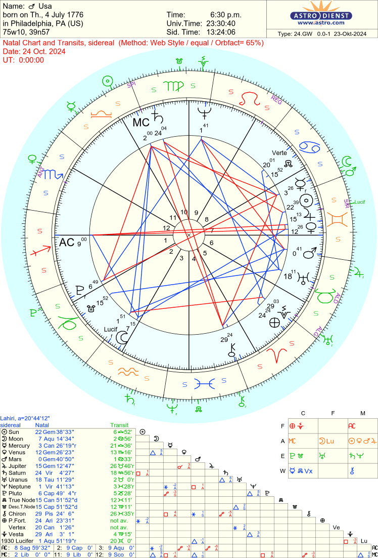 That said, the July 4th, 1776, at 6:30 PM, in Philadelphia, gives the U.S. a Sagittarius rising at 9°, which aligns with the country’s philosophical and expansive nature. Sagittarius, the sign of the explorer, embodies the U.S.'s drive for growth, exploration, and the desire to project its values onto the global stage. This Sagittarius rising reflects the nation's deep-seated belief in freedom, expansion, and optimism—qualities that continue to define its identity.